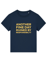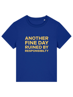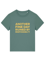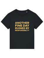 Introducing Teevolution's legendary Women's Slogan T-shirt: "Another Fine Day Ruined by Responsibility"! This cheeky tee is the perfect way to express your inner rebel while adding a dash of humour to your wardrobe. Crafted from our vegan-friendly, organic cotton, it’s not just stylish but also kind to our planet – a proper win-win!