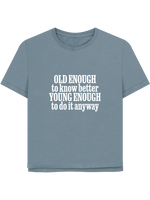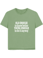 Some lessons in life? Learned. Others? Ignored (on purpose). Our Old Enough Women's Relaxed Fit T-Shirt is for the legends who know better but still press that ‘Why Not?’ button. Featuring the cheeky slogan "Old enough to know better, young enough to do it anyway", this slogan tee is a nod to living life on your own terms.
