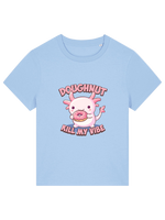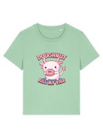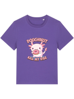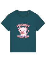 Love doughnuts, axolotls, and keeping your vibe unbothered? Then this tee was made for you! Featuring an adorable axolotl mid-snack attack on a doughnut, plus the cheeky slogan Doughnut Kill My Vibe, this funny women's graphic t-shirt is perfect for snack lovers, chill queens, and anyone who doesn’t have time for bad energy.
