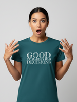 With its laid-back fit and cheeky slogan, this tee is your go-to for brunches, nights out, or just lounging around in style. Plus, with plastic-free packaging, we keep our oceans happy while you rock your wicked humour. So, what are you waiting for? Join the Teevolution and make your wardrobe as fun and fierce as you are! Grab yours today and wear those “bad decisions” like a badge of honour!
