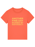Introducing Teevolution's legendary Women's Slogan T-shirt: "Another Fine Day Ruined by Responsibility"! This cheeky tee is the perfect way to express your inner rebel while adding a dash of humour to your wardrobe. Crafted from our vegan-friendly, organic cotton, it’s not just stylish but also kind to our planet – a proper win-win!