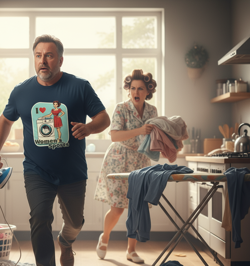 Who said domestic chores don’t count as cardio? Our Lady Sports T-shirt takes a swing at outdated ideas with a graphic of a retro housewife beside her trusty washing machine, proudly declaring: “I love women’s sports.” It’s satire at its finest – equal parts sassy and savage.