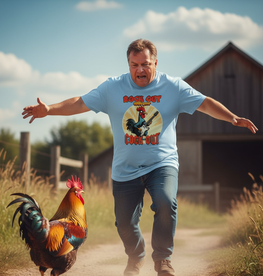 Meet the tee that turns up the volume and cranks up the laughs! Our Rock Out T-Shirt features a badass cockerel absolutely shredding on guitar, alongside the legendary phrase: "Rock Out with Your Cock Out." Whether you're headbanging at a gig, jamming in the car, or just causing a stir at the pub, this tee guarantees instant rockstar status (or at least a few chuckles).