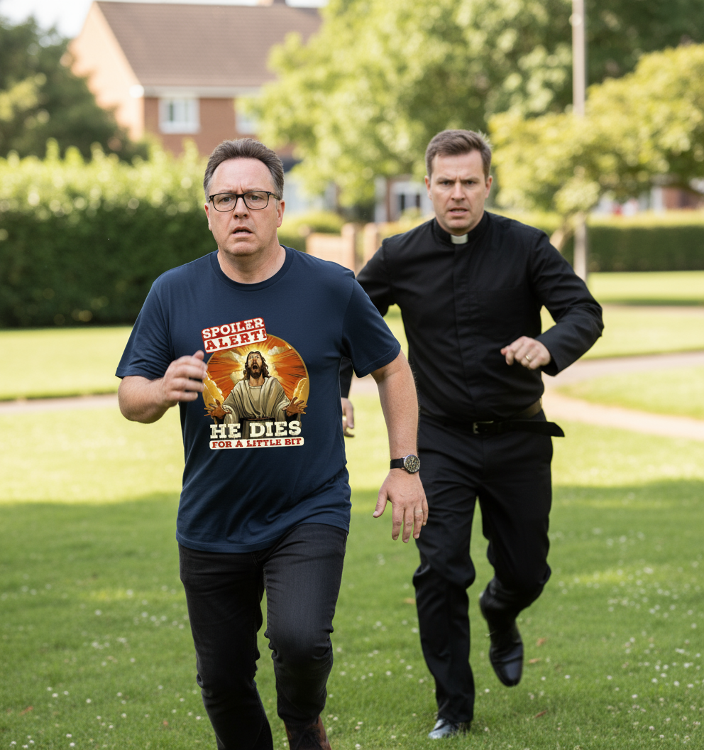 Raise your glass (and your brows) for the Spoiler Alert Graphic T-Shirt, featuring a wide-eyed Jesus and the cheeky line: “Spoiler alert: He dies for a little bit.” Divine comedy? Nailed it.