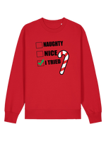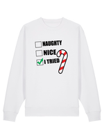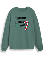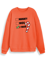 This isn't just any funny Christmas Jumper; it's a statement piece for anyone who's given it their best shot. Our unique Christmas sweater design features 'Naughty', 'Nice', and a hilariously ticked 'I Tried' box – perfect for those festive shenanigans down the local or your family's Zoom quiz.