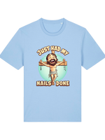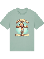 Forgive us, Father, for we have... made you laugh. The Nails Done T-Shirt is here to bless your wardrobe with a divinely cheeky twist. Featuring a bold graphic of Jesus on the cross with the words I’ve just had my nails done, this tee is guaranteed to turn heads, spark a chuckle, and maybe even cause a miraculous double take.