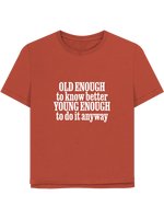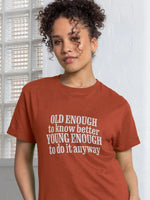 Some lessons in life? Learned. Others? Ignored (on purpose). Our Old Enough Women's Relaxed Fit T-Shirt is for the legends who know better but still press that ‘Why Not?’ button. Featuring the cheeky slogan "Old enough to know better, young enough to do it anyway", this slogan tee is a nod to living life on your own terms.