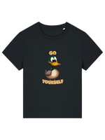 Looking for a T-shirt that speaks your mind without saying too much? Say hello to the Duck Yourself Women’s T-shirt. Featuring a cheeky duck and the bold words “Go Yourself,” this tee is perfect for those moments when you want to get your point across with a bit of attitude.
