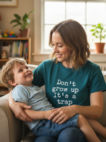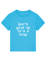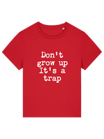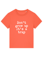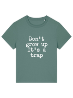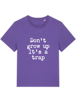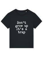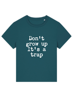 Introducing our legendary Women’s Slogan T-shirt – the cheeky reminder you didn’t know you needed! With the bold slogan “Don’t grow up, it’s a trap,” this tee is perfect for the free-spirited woman who knows that adulting is highly overrated. Made from soft, organic cotton that’s kinder to the planet, this fabulous top not only makes a statement but also helps us keep it green.