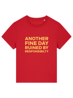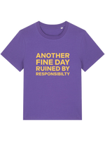 Introducing Teevolution's legendary Women's Slogan T-shirt: "Another Fine Day Ruined by Responsibility"! This cheeky tee is the perfect way to express your inner rebel while adding a dash of humour to your wardrobe. Crafted from our vegan-friendly, organic cotton, it’s not just stylish but also kind to our planet – a proper win-win!