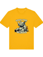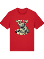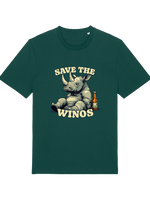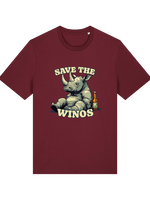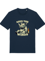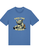This ain't your average, run-of-the-mill tee, folks. We’ve slapped a hilariously tipsy rhino graphic on front, because let's face it, who doesn't love a good bit of anthropomorphism, especially when it involves a rhino who's clearly had one too many grapes. The slogan "Save the Wino's" is a tongue-in-cheek plea to humanity, or maybe just a good excuse to crack open another bottle. Either way, it hits the spot.
